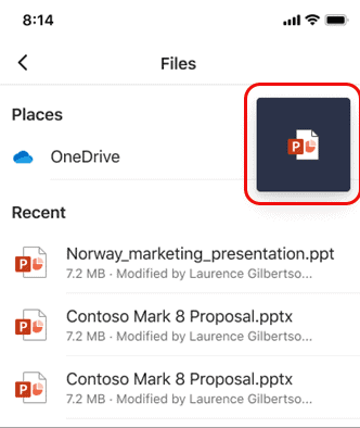 - Choose the PowerPoint presentation that you would like to project by finding it and tapping it. You will be able to view recent presentations that you have opened as well as presentations that you have stored in OneDrive.